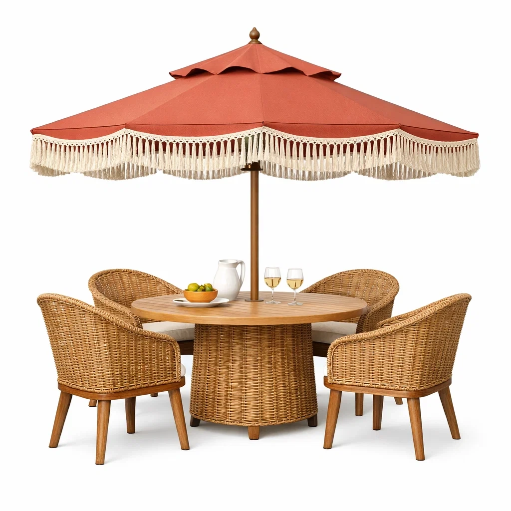 Description: Outdoor dining set with wooden table and rattan chairs. Red umbrella with fringe details for sun protection in the garden.