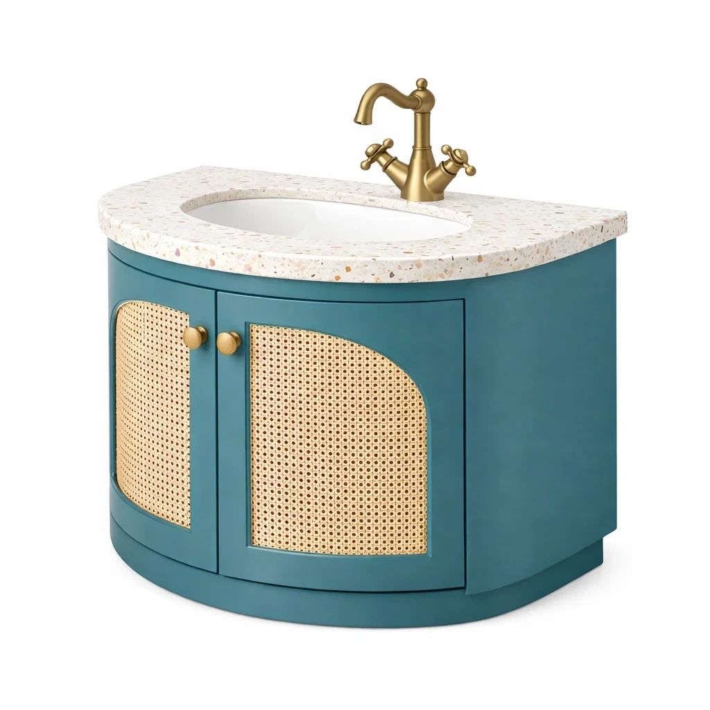 Description: Vanity unit in blue with terrazzo marble countertop. Rattan doors and golden details for a modern touch in your bathroom.